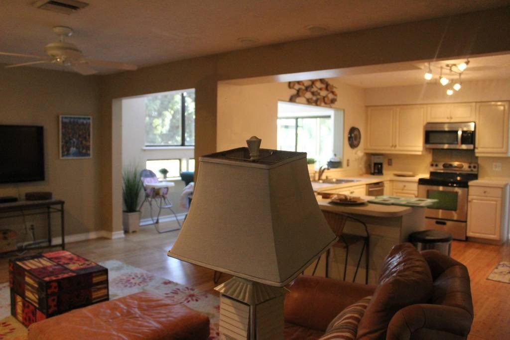 Guests can access three bedrooms, two bathrooms, an office, sun-room, living room, family room with wood burning fireplace and kitchen. There is also a screened in patio, outdoor patio and pool areas for guests
